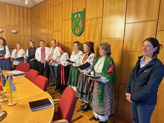 Dazu waren der ukrainische Chor Ukrainische Lastivky unter Leitung von Irina Tkachenko, Vertretende des KESS Familienzentrums und das Team Flüchtlingshilfe anwesend. Online zugeschaltet hatte sich auch Dr. Hamalij, der viele Projekte mit begleitet hatte.
