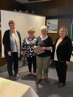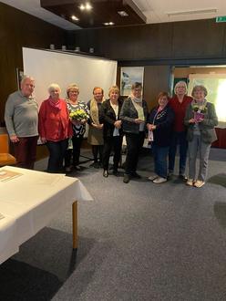 Renate Brandt (Gartenfreundinnen), Brigitte Vogel (Kreativgruppe), Rita Mund (Spielegruppe), Ille Cammann (Tischdeko) und Annelie Hetz ( Spendensammlerin fürs Onkoforum). Alle haben auch in der letzten Saison viel dafür getan, dass unser Verein lebendig und vielfältig bleibt. Ein besonderer Danke galt Christiane Strohmeyer, die jahrelang sehr erfolgreich die Kinoabende geleitet und organisiert hat. Christiane gibt ihr Amt jetzt an Klaudia Piliptschuk zurück.Solche engagierten Frauen, das gilt auch für unsere sehr aktiven Ortsvertreterinnen, machen unseren Verein so liebenswert. Danach folgten Ehrungen und Verabschiedungen. Ann-Katrin Berkhan, unsere Kreisvorsitzende verabschiedete Gudrun Sundermann nach langer Vorstandsarbeit und überreichte ihr im Namen des Verbandes die „Silberne Biene mit grünem Stein“ für ihre geleistete Arbeit.