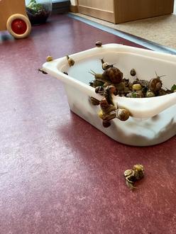 Alljährich planen wir zum Ende des Kindergartenjahres einen kleinen Ausflug. So bereiten wir uns in diesem Jahr mit unseren Krippenkindern, „Die Schäfchen“, auf einen Besuch der Naturkontaktstation vor. Um das Projekt zu vertiefen, bekamen die Kinder übers Wochenende eine kleine Hausaufgabe auf. Sie hatten den Auftrag, Schnecken zu suchen und diese mitzubringen, damit wir sie in der Gruppe und in unserem gemeinsamen Morgenkreis mit allen Gruppen beobachten können. Dank der tatkräftigen Unterstützung der Eltern durften wir ca. 500 Schnecken kennenlernen. Eine Familie hat uns sogar ein Terrarium für Schnecken hergestellt. Das hat uns ermöglicht, die Schnecken über einen kleinen Zeitraum in unserem Haus beobachten zu können. Aktuell lassen wir Marienkäfer in unserer Gruppe heranwachsen. Aus Larven werden die niedlichen Käfer. Inzwischen konnten wir bereits mehrere begrüßen und in die Freiheit entlassen. Zur Vorbereitung auf dieses spannende Thema haben wir die örtliche Bücherei besucht und passende Bücher für uns ausgesucht. Aus verschiedenen Muscheln, einem Urlaubsmitbringsel, haben die Kinder unter unserer Anleitung Marienkäfer gebastelt. Darüber hinaus vertiefen wir die Themen in unserem täglichen Morgenkreis durch verschiedene Lieder und Fingerspiele. Mitte der Woche spendeten uns Eltern Himbeerpflanzen, die wir mit großer Freude in unseren Garten auf dem Außengelände eingepflanzt haben. Ganz am Ende dieses Projektes steht der Ausflug zur Naturkontaktstation auf den wir uns alle schon sehr freuen.
