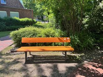 Vor dem Eingang des Rathauses in Wathlingen befindet sich die orangene Bank. Auch hier finden Sie die Kontaktdaten, die Sie bei Hilfe nutzen können.