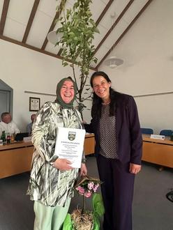 – dafür bedankte sich Samtgemeindebürgermeisterin Claudia Sommer in der Samtgemeinderatssitzung am 21.05.2025 bei Ratsfrau Suzan Yilmaz mit einem Blumenstrauß, einem Birnenbäumchen und einer Urkunde.