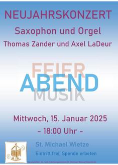| 18.00 Uhr | St. Michael, Feierabendmusik mit Axel LaDeur und Thomas Zander und anschließendem Empfang |