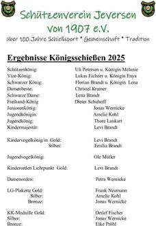 Am folgenden Tag wurden vormittags die neuen Könige auf dem Schießstand ermittelt. Der 1.Vorsitzende Uli Petersen, dessen Enkelkind am Vortag zur neuen Kindermajestät proklamiert wurde, ließ es sich nicht nehmen, auf einen Königstitel zu schießen. Er wurde neuer Schützenkönig, gefolgt von Lukas Eichner als Vizekönig. Auch Florian Brandt, der Vater der Kindermajestät Levi Brandt, nahm die Gelegenheit wahr und versuchte einen Königstitel zu erringen, was ihm gelang. Er wurde neuer Schwarzer König in Jeversen. Die Familien Petersen/Brandt konnten insgesamt fünf Würdentitel in diesem Jahr erringen: Schützenkönig der 1. Vorsitzender Uli Petersen mit Königin Melanie. Schwarzer König Florian Brandt mit Königin Lena, die gleichzeitig auch den Titel „Schwarze Dame“ errang.