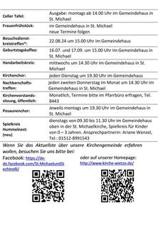 | 10.15 Uhr | St. Michael, Regionaler Gottesdienst mit Abendmahl (Saft), Pn. Matern |