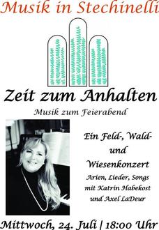 | 18.00 Uhr | Stechinelli, Zeit zum Anhalten mit Axel LaDeur und Katrin Habekost. Ein Feld-, Wald- und Wiesenkonzert. |