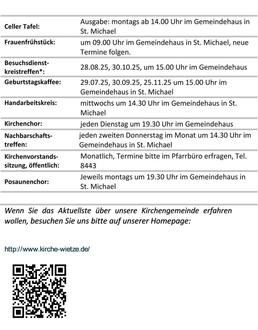 | 10.15 Uhr, | St. Michael, Gottesdienst mit Abendmahl (Saft) und anschließendem Kirchenkaffee, P. Ricker |