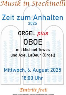| 18.00 Uhr, | Stechinelli, Zeit zum Anhalten mit Axel LaDeur (Orgel) und Michael Tewes (Oboe), der Eintritt ist frei. |
