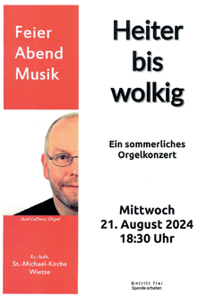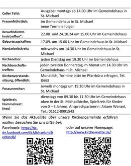 | 10.00 Uhr | St. Michael, Gottesdienst mit Taufen und anschließendem Kirchenkaffee, Pn. Matern |