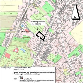 Die Anwendung dieser Satzung erstreckt sich auf die in der nachfolgenden Planzeichnung im Maßstab 1:5000 dargestellten (schwarz-weiß gestrichelt umrandeten) Flurstücke Nrn. 76/27 und 76/33, Flur 8 der Gemarkung Wietze.