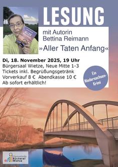 Am 18. November um 19.00 Uhr im Bürgersaal in Wietze gibt es spannende Ausschnitte aus diesem Buch - aber auch bereits einen Ausblick auf den nahen Advent, denn das Weihnachtsbuch „Plätzchen. Diebe. Fest der Liebe - Band 2“ erscheint zwei Wochen zuvor. Und im Kontrast zum spannenden Krimigeschehen ist Bettina Reimann in diesem Buch vierer hannoverscher Autorinnen stark für die Sparte „Humor“ zuständig.