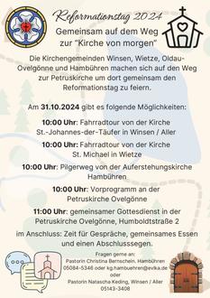 | 10.00 Uhr | Treff an der St. Michaelkirche in Wietze. Gemeinsamer Aufbruch mit dem Fahrrad (oder dem Auto) zum Gottesdienst nach Ovelgönne in die Petruskirche, der um 11.00 Uhr beginnt. Ein gemeinsames Essen und ein Reisesegen rahmen das Ganze ab. Sie sind herzlich eingeladen mitzumachen. (Näheres entnehmen Sie bitte den Aushängen) |