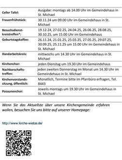 | 10.00 Uhr | St. Michael, Gottesdienst mit Abendmahl (Saft), Chor und Totengedenken, Pn. Matern |
