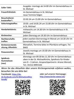 Am Donnerstag, 15.02.24 findet um 19.30 Uhr im Gemeindehaus in St. Michael Wietze ein Elternabend für den aktuellen Konfirmandenkurs statt.