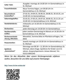 | 10.00 Uhr, | Gemeindehaus St. Michael, Gottesdienst mit anschließender Gemeindeversammlung und Kirchenkaffee, P. Ricker |