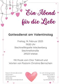 | 19.00 Uhr, | Stechinelli, Gottesdienst zum Valentinstag mit dem Chor „Taktvoll“, Pn. Bernschein |