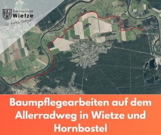 In der Zeit vom 12. bis 29. Februar 2024 werden auf dem Allerradweg innerhalb des Abschnittes vom Schachtgelände in Wietze bis zum Tannenpark in Hornbostel (siehe Lageplan) Baumpflegearbeiten durchgeführt. Die Arbeiten werden in Abschnitten durchgeführt; der jeweils aktive Abschnitt wird mit einer Gefahrenbeschilderung ausgewiesen. Eine Durchfahrt ist dort dann nicht möglich.