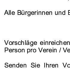 Vorschläge einreichen. Bei den Vereinen und Verbänden ist das Vorschlagsrecht auf eine Person pro Verein / Verband begrenzt.