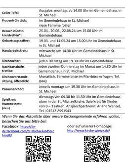 | 10.00 Uhr | Gemeindehaus St. Michael, Gottesdienst (Kirchenvorstandswahlen), Pn. Matern |