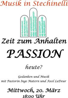 | 18.00 Uhr | Stechinelli, Zeit zum Anhalten mit Axel LaDeur und Pn. Matern unter dem Motto:“ Passion heute?“ |