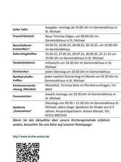 | 10.00 Uhr, | St. Michael, Gottesdienst mit anschließendem Kirchenkaffee im Gemeindehaus, H. Hoppenstedt, Lektor i. A. |