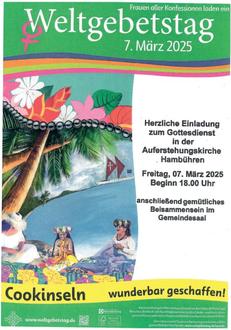 | 18.00 Uhr (geänderte Anfangszeit!!!), | Hambühren, Auferstehungskirche, gemeinsamer ökumenischer Nachbarschaftsgottesdienst zum Weltgebetstag. (Die Kirchengemeinde Wietze feiert zusammen mit Hambühren.), Lektorin Schiemann |
