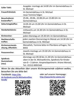 | 19.00 Uhr | Gemeindehaus St. Michael, Tischabendmahl, Anmeldungen erbeten, Pn. Matern |