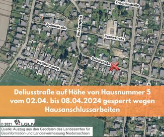 Die Deliusstraße wird auf Höhe der Hausnummer 5 vom 02.04. bis 08.04. aufgrund von Hausanschlussarbeiten durch die Firma Rohr- und Tiefbau Hoya GmbH vollständig gesperrt sein.