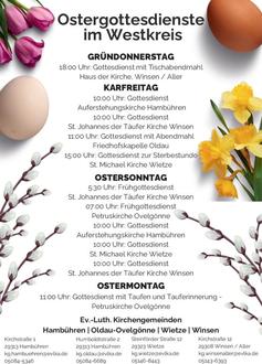 | 10.00 Uhr, | St. Michael, Festgottesdienst zum Ostersonntag mit Posaunenchor, P. Schwarz |
