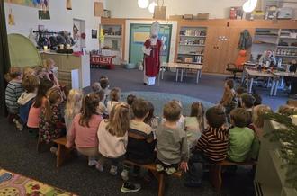 Gegen Vormittag klopfte es leise an der Tür. Der Nikolaus trat ein, begrüßte die Kinder herzlich und lobte ihren Zusammenhalt, ihre Hilfsbereitschaft und ihre schönen Adventsbasteleien - aber auch Dinge, an denen die Schulgeister noch arbeiten können. Gemeinsam sangen die Gruppen ihr Nikolauslied, worüber sich der Nikolaus sehr freute.