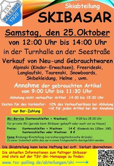 | Sa | 25.10. | 12:00 – 14:00 | Skibasar des TSV Palling – Skiabteilung Turnhalle |