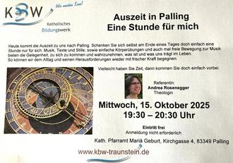 | Mi | 15.10. | 19:30 – 20:30 | „Auszeit in Palling – Eine Stunde für mich“ Pfarrheim Palling |