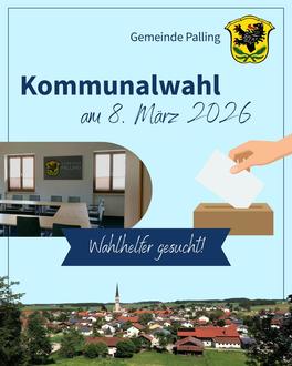 Wer Interesse hat, bei der Durchführung der Kommunalwahl am Wahltag zu helfen, der kann sich gerne bis zum 16.12.2025 im Rathaus Palling melden, bevorzugt per E-Mail unter poststelle@palling.bayern.de, oder telefonisch unter der 08629/9882-12.