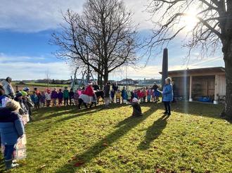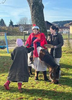 Einen Tag nach unserem großen Martinsfest, am Mittwoch, 12.11.25 feierten wir im Kindergarten ein besonderes Martinsspiel. Christine mit ihrem Pony Moritz wurden von den Kindern mit ihren Laternen voller Freude begrüßt. Mit Alexander als Martin und Marina als Bettler, erlebten wir alle gemeinsam während Anita die Martinslegende vorlas die schöne Tradition. Mit Moritz voraus gingen die Kinder mit ihren Laternen im Garten und sangen bekannte Martinslieder. Zum Abschluss durften die Kinder untereinander Kekse teilen. Ein schönes Zeichen gelebter Nächstenliebe.