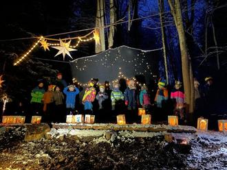 Als nun der große Moment gekommen war, hüpften die Kinder auf die eigens errichtete Bühne, schlüpften in Verkleidung und Rolle verschiedener Tiere und führten im Licht von Sternenglanz und Laternen die Geschichte vom kleinen Maulwurf und den Sternen auf, die dem gebannten Publikum auf herzerwärmende Weise näherbrachte, dass der Sternenglanz - stellvertretend für alle Wunder dieser Welt - allen gehört und erst im Miteinanderbestaunen und Miteinanderteilen seine wahre Schönheit entfaltet. Untermalt wurde die Aufführung von mal lauten, mal leiseren Tönen auf Glockenspiel und Handpan sowie mehreren Liedern mit Gitarrenbegleitung, Stücke, die die Kinder durch ihren kräftigen Gesang und ihre einstudierte Choreografie zum Leben erweckten. Gefangen von der wunderbaren Atmosphäre der Geschichte und der Stimmung im winterlichen Wald lauschten die Zuhörer bis zum Schluss mucksmäuschenstill und belohnten die sehr mutigen und textsicheren Schauspieler und Musiker am Ende mit kräftigem Jubel und Applaus für diese bezaubernde Aufführung.