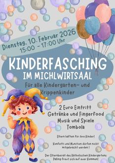 | Di 10.02. | 15:00 – 17:00 | Kinderfasching für alle Kindergarten- und Krippenkinder, Michlwirt-Saal |