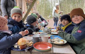 Abseits all dieser Aktionen und Besuche drehte sich im Waldkindergarten in den vergangenen Wochen natürlich alles um die Themen Frühling und Ostern. Zur Vorbereitung auf das Osterfest hatten die Kinder aus Naturmaterialien und Wolle schmucke kleine Osternester gebastelt und an mehreren Tagen Ostereier gefärbt. Dabei zeigten ihnen die ErzieherInnen wie man ganz einfach und natürlich mit Lebensmitteln wie Kurkuma und Rotkohl farbenfrohe Ostereier gestalten kann. Damit nicht genug wartete in der letzten Woche vor den Ferien die alljährliche große Osterolympiade auf die Kinder. An verschiedenen Stationen – beispielsweise beim Sackhüpfen, dem großen Eierlauf oder dem Osterhasenweitsprung – konnten die Kinder ihre Geschicklichkeit und ihr Können unter Beweis stellen, wobei natürlich auch der Spaß nicht zu kurz kam. Belohnt wurden die eifrigen Osterolympioniken im Rahmen der großen Siegerehrung mit einer schmackhaften und gesunden Karotte.