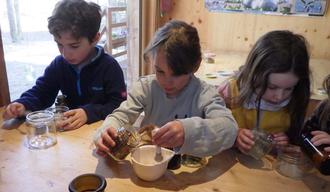 Nächstes Highlight war die Herstellung verschiedener Räuchermischungen zusammen mit der Mama und Oma eines Kindergartenkinds, die Rosenblätter, Weihrauch, verschiedene Kräuter wie Salbei und Lorbeer und viele interessante Infos im Gepäck hatten. Bevor sich die Kinder selbst ans Mörsern und Mischen machen durften, konnten sie erst einmal ausgiebig an den verschiedenen Bestandteilen schnuppern und Inhaltsstoffe für ihre eigene Räuchermischung auswählen. Die Kinder waren mit Feuereifer bei der Sache und kreierten tolle Düfte. Zum krönenden Abschluss wurde zusammen geräuchert und die beiden Besucherinnen hatten darüber hinaus auch noch Geschenke dabei: Eine eigene Räucherpfanne für den Kindergarten und für die Kinder einen Schutzengel oder eine Prismakugel.