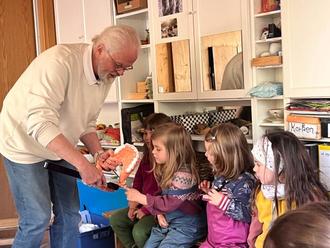 Eine Woche später erhielten die Pustis schon wieder Besuch, dieses Mal vom Pallinger Zahnarzt Dr. Galneder, der den Kindern viel über die Zähne, das Zähneputzen und seinen Beruf als Zahnarzt erzählte und viele Fragen an die Kinder hatte. So wurde beispielsweise im Gespräch gemeinsam gesammelt, welche Nahrungsmittel für die Zähne gesund sind und welche ihnen schaden. Abschließend erhielt jedes Kind am Ende eine kleine Tasche mit einer Zahnbürste, Zahnpasta und einem Zahnputzbecher.