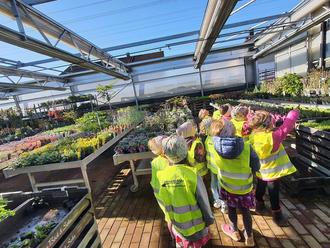 Bei sonnigem Wetter wanderten die Kinder mit ihren Erzieherinnen in die nahegelegene Gärtnerei, wo sie von Herrn Deutschmann begrüßt wurden.