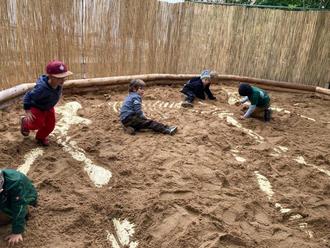 Der zweite Teil des Vormittags spielte sich im Außenbereich des Museums ab, wo ein Lagerfeuer entzündet wurde und viele verschiedene Aktivitäten auf die Kinder warteten. In einem großen Sandhaufen konnten sie sich als Forscher betätigen und Mammutknochen ausgraben oder Edelsteine suchen. Wer lieber kreativ sein wollte, durfte einen Kraftstein bearbeiten, eine Kette aus Rinde und Federn basteln oder sich selbst mit Tonerde bemalen.