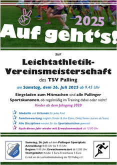 Der TSV Palling lädt alle sportbegeisterten Kinder (ab Jahrgang 2020), Eltern, Onkel und Tanten zur Vereinsmeisterschaft am Samstag, 26. Juli 2025 ab 9:45 Uhr ein!