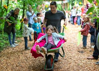 Am Ende des offiziellen Programms stand der sinnbildliche Rausschmiss aus dem Kindergarten: Nach einer letzten rasanten Schubkarrenrunde durch den Kindergarten (Schwerstarbeit für die Papas) durften sich die Wackelzähne im blumengeschmückten Spalier, den die Gäste und die übrigen Pustis am Eingang gebildet hatten, lautstark anfeuern und bejubeln lassen. So viel Aufregung macht natürlich hungrig. Wie gut, dass die Waldkindergartenfamilie wieder für ein riesiges buntes Buffet, das für jeden Geschmack etwas bereithielt, gesorgt hatte, über das sich die fröhliche Kinderschar und ihre Gäste nun hermachten und so die Verabschiedung noch weiter ausgelassen feierten.