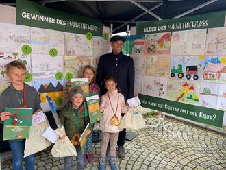 Die Erstplatzierten der vier Altersgruppen des Malwettbewerbs „Was macht die Bäuerin oder der Bauer“ der ILE Zukunftsregion Rupertiwinkel von links: Maximilian Seehuber, Linus Schwarzer, Olivia Enderle, Euphenia Flora Denk mit Hans-Jörg Birner, Vorsitzender der ILE Zukunfsregion Rupertiwinkel und Bürgermeister von Kirchanschöring.