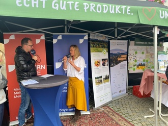 Wie viel Leidenschaft in der Landwirtschaft steckt und wie wichtig die Rolle der Konsumenten ist, zeigten die Gespräche während der Live-Sendung der Bayernwelle am ILE-Stand. Moderator Thorsten Jost befragte ganz unterschiedliche Personengruppen rund um das Thema regionale Landwirtschaft und sorgte in den Gesprächen für interessante bis außergewöhnliche Einblicke. Dabei ließ er Alexandra Huber von der Geschäftsführung der ILE, den vorangegangenen Bauernratsprozess erläutern und welche laufenden und künftigen Aktivitäten daraus entstanden. Richtig greifbar wurde die Bedeutung der Landwirtschaft immer dann, wenn die Fachpraktiker, also die Bäuerinnen und Bauern selbst zu Wort kamen und mit leuchtenden Augen von ihrem Beruf erzählten: