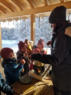 Poporutschal fahren, und zwar auf einer richtig langen Eisbahn vor der Hütte, den verschneiten Hügel runterkugeln, “Dinoknochen“ im Schnee ausgraben, Eis erforschen oder Fußabdrücke der Waldtiere finden und bestimmen. All das konnten die Waldwichtel die letzten zwei Monate im winterlich verschneiten Wald im Waginger Waldkindergarten machen. Doch nicht nur wildes, lustiges Toben und ausgiebiges Forschen machte den Kindern viel Spaß, auch das Basteln beim gemütlichen Beisammensitzen in und außerhalb der Hütte freute sie: Sterne wurden gefaltet, Knete erst selbst hergestellt und dann “gebazelt“, Bilder von den drei Spatzen im Haselstrauch (nach einem Gedicht von Christian Morgenstern) gemalt und Kerzen aus heißem Bienenwachs gezogen (siehe Bild). Stürmisch zeigte sich das Wetter in letzter Zeit und die Hütte bot den Waldwichteln einen windstillen, warmen Unterschlupf. Hier durfte mit Brettspielen gespielt, Kaba getrunken und Pudding gegessen werden. Eine willkommene Abwechslung zu den winterlichen Tagen draußen im Wald. Der Skikurs war auch dieses Jahr wieder ein voller Erfolg. Da kaum Schnee lang, war nicht klar, ob es klappen würde. Aber das Glück war auf der Seite der Waldwichtel! In der Woche des Skikurses schneite es noch und zehn Kinder konnten in Inzell vormittags eine Woche auf den Skiern stehen und als Anfänger die ersten Erfahrungen sammeln oder schon als Fortgeschrittene ihr Können verbessern.