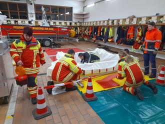 Bei der dritten Station galt es verschiedene Arten einer Standard-Dekontamination zu errichten. Sobald ein Trupp mit Atemschutzgeräten oder auch mit Chemikalienschutzanzügen in den Gefahrenbereich vorgeht, muss bereits die Möglichkeit einer Sofortdekontamination möglich sein. Ein "Dekon-Platz" der sogenannten "Stufe II" muss dann im Anschluss grundsätzlich nach spätestens 15 Minuten betriebsbereit sein. Um eine Kontaminationsverschleppung zu vermeiden, wird dabei als erstes der Untergrund vollständig mit einer verschiedenfarbigen Folie ausgelegt. Die unterschiedlichen Farben kennzeichnen dabei die Grenze vom Schwarzbereich (also dem kontaminierten Bereich) zum sauberen Weiß-Bereich. Die darauf befindliche Duschwanne kann aus Steckleiterteilen, Saugschläuchen oder auch übereinander gelegten und mit Wasser gefüllten Feuerwehrschläuchen und einer Plane erstellt werden. Martin Pöllner zog im Anschluss an die Übungen ein positives Fazit: "Brandbekämpfung und technische Hilfeleistungen gehören zum "Tagesgeschäft" einer Feuerwehr. Bei einem Thema wie Gefahrgut, welches nicht alltäglich auf der To-Do-Liste der Einsatzkräfte steht, ist es daher besonders wichtig, die benötigten Handgriffe und das spezielle Wissen zum Schutz der Bevölkerung und der Umwelt immer wieder "aufzuwärmen"."