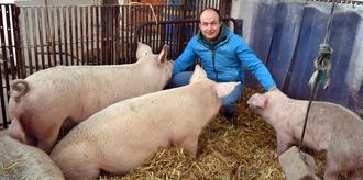 Schweinemast: Markus Kroiß streichelt einige Schweine. Mit Spaltenböden und behördlichen Auflagen hat Markus Kroiß keine Probleme.