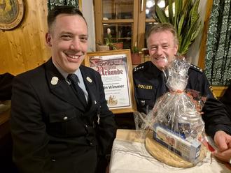 Mit einer besonderen Ehrung würdigte Kommandant Michael Schramke den Leiter der Polizeiinspektion Laufen, Erwin Wimmer. In seinen Grußworten hatte der Dienststellenleiter die Feuerwehr Waging außerordentlich gelobt. Seit jeher herrsche eine exzellente Zusammenarbeit zwischen Polizei und Feuerwehr. Viele Einsätze der Polizei seien ohne die ehrenamtlichen Kräfte der Feuerwehr gar nicht möglich, so Wimmer. Als Dienstellenleiter gehe er demnächst in Pension. Für seine Verdienste erhielt er von der Feuerwehr Waging eine Ehrenurkunde un besondere Erinnerungsgeschenke wie ein Feuerwehrkrügerl und ein Fahrzeugmodell des Waginger Tanklöschfahrzeuges im Maßstab 1:87.