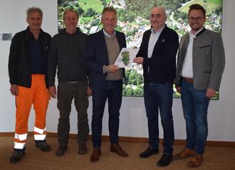 Andreas Bratzdrum nahm das Pflegekonzept aus den Händen von Wolfgang Schuardt entgegen. Mit dabei: Bauhof-Leiter Martin Maier und Stadtrat Hans Glück (v.l.) sowie Kreisfachberater Markus Breier (re.).