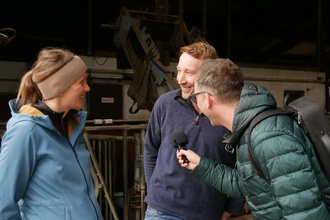 Corinna und Josef Egger auf Ihrem Hof in Waging bei der ersten Aufnahme des neuen Podcast „UNSERE LANDWIRTSCHAFT – dabei sein und verstehen“ mit Moderator Thorsten Jost.